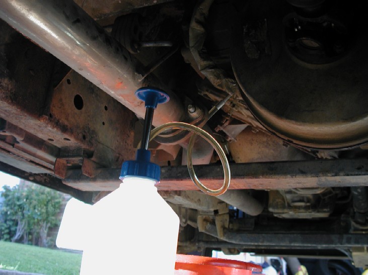 So when you are ready, hook your little fill pipe into the hole and get pumping!! Fill the box until the oil runs in a 2mm bead from the fill/level plug. As stated, it will need about 2.3 litres, so I had to refill my little pump two times to finish the job.
