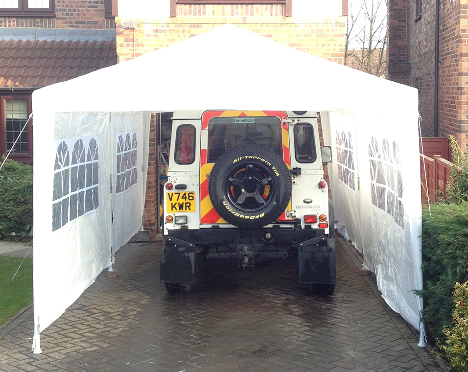 First step, prepare the area you’re working in. Clean it, brush it down. If you’re indoors, great! But you can apply Plastidip outside no problem. We decided to go halfway in between, in a budget outdoor gazebo – as it was the middle of winter. Applying in cold weather will slow down the curing process, but seemed to have no adverse effects to our application