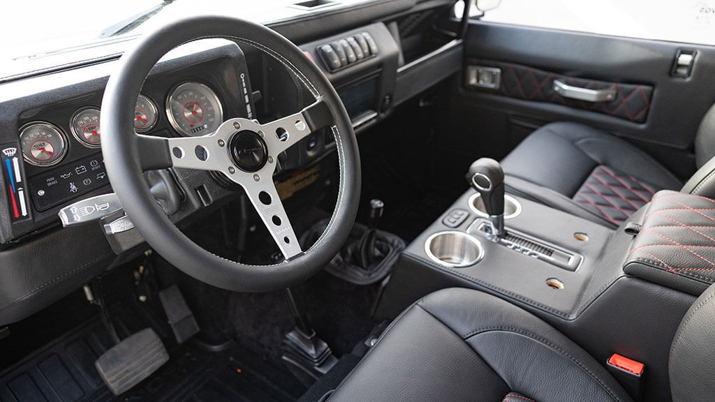 In the cabin, this older Defender 90, which features a fresh rag top, comes with a pair of comfortable front seats that sport integrated headrests and additional side bolstering. Black leather upholstery stitched together with red string in a diamond pattern is the dominating material here, and since it came from a different age, there is a MOMO steering wheel on deck that doesn’t feature an airbag.