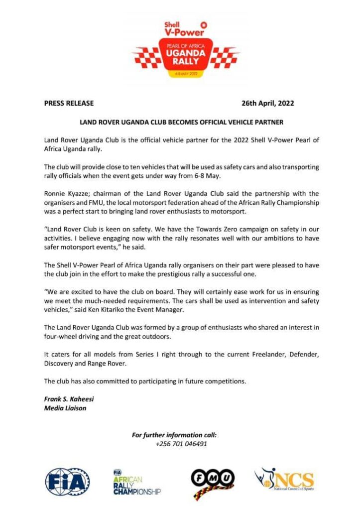 It’s official – the Land Rover Uganda Club has this afternoon (26 April 2022) become the Official vehicle support partner for the Shell V-Power Pearl of Africa Uganda Rally, an international rally event organised by the Federation of the Motorsport Clubs of Uganda (FMU) under the Africa Rally Championship Series (ARC) with the overall governance of the Fédération Internationale de l’Automobile (FIA).
