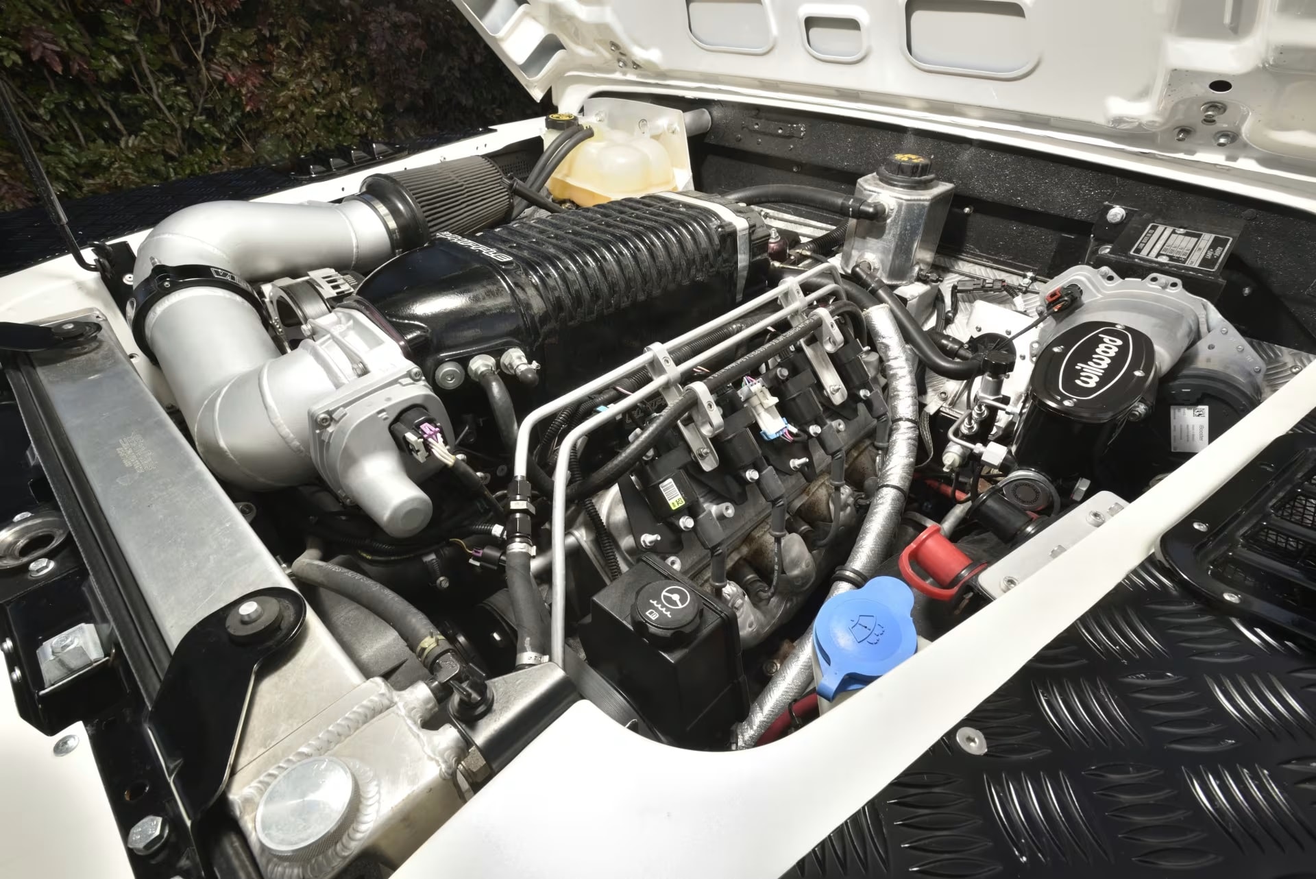 The LS3 V8 sends power to all four wheels through a 6L80E 6-speed automatic transmission, also sourced from GM Performance Parts, and a dual-range transfer case.