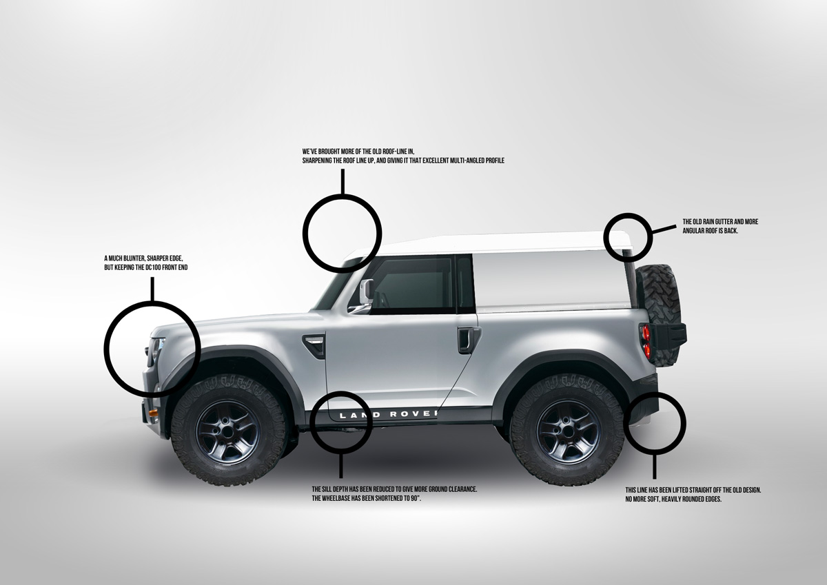 So, now to put it all together. The DC100 is perhaps just a bit too far ahead of it’s time. The Defender has, and always will be, 20 years behind in terms of design. The jump Land Rover have made is too big, but there are changes and tweaks they could make to the new concept car to reflect more of the vehicle’s past. So, we’ve incorporated everything that makes a Defender into the PR photos.